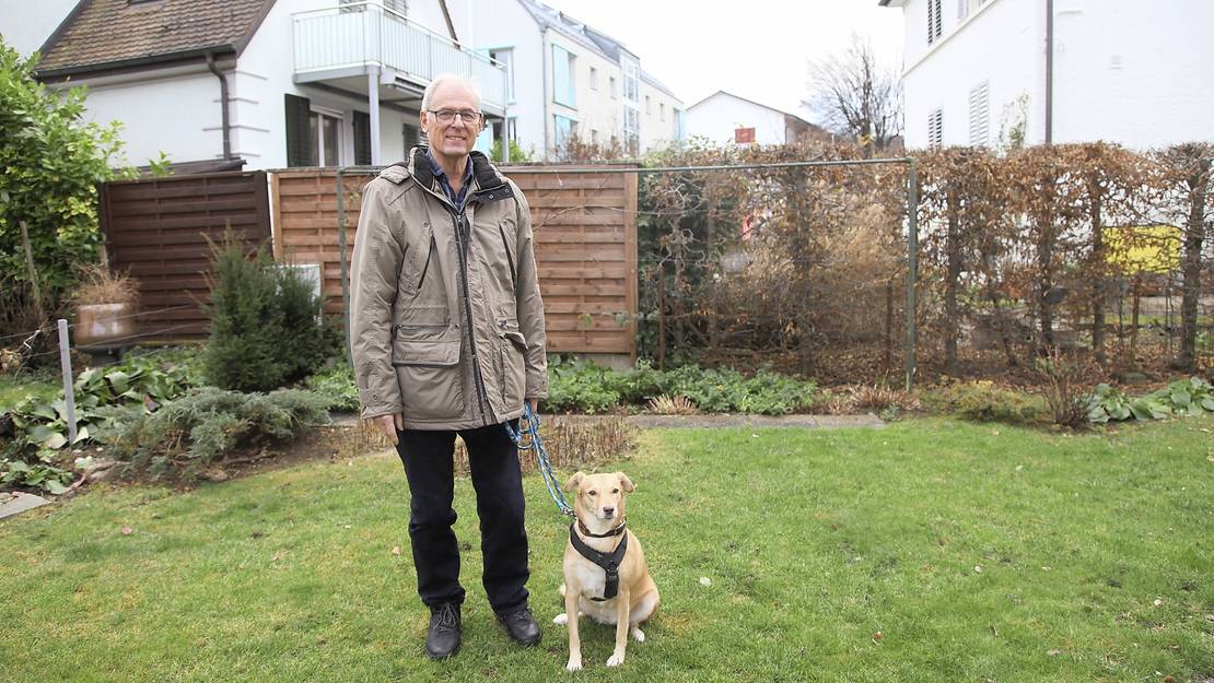 Der Präsident der Hunde-Partei, Walti Ogi, zusammen mit Hündin Kyla in seinem Garten. Er kämpft gegen das «rostige» Zürcher Hundegesetz.Bild ch.
